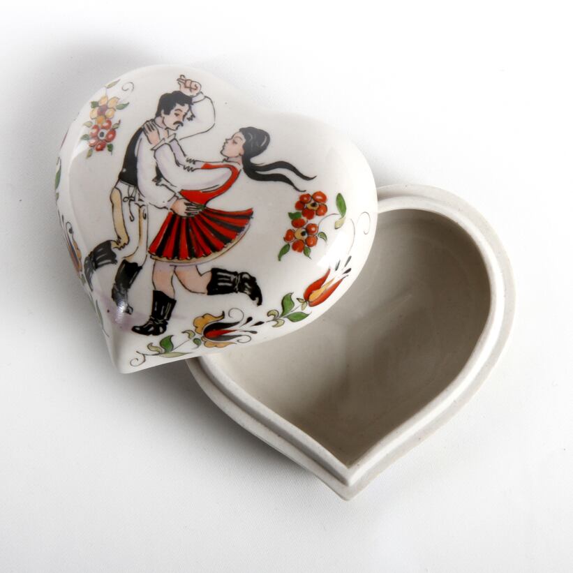 ルーマニア、トランシルバニア東部のセーケイ地方の民族衣装でフォークダンスをする男女の絵付けが可愛いハート型の蓋付き小物入れです。