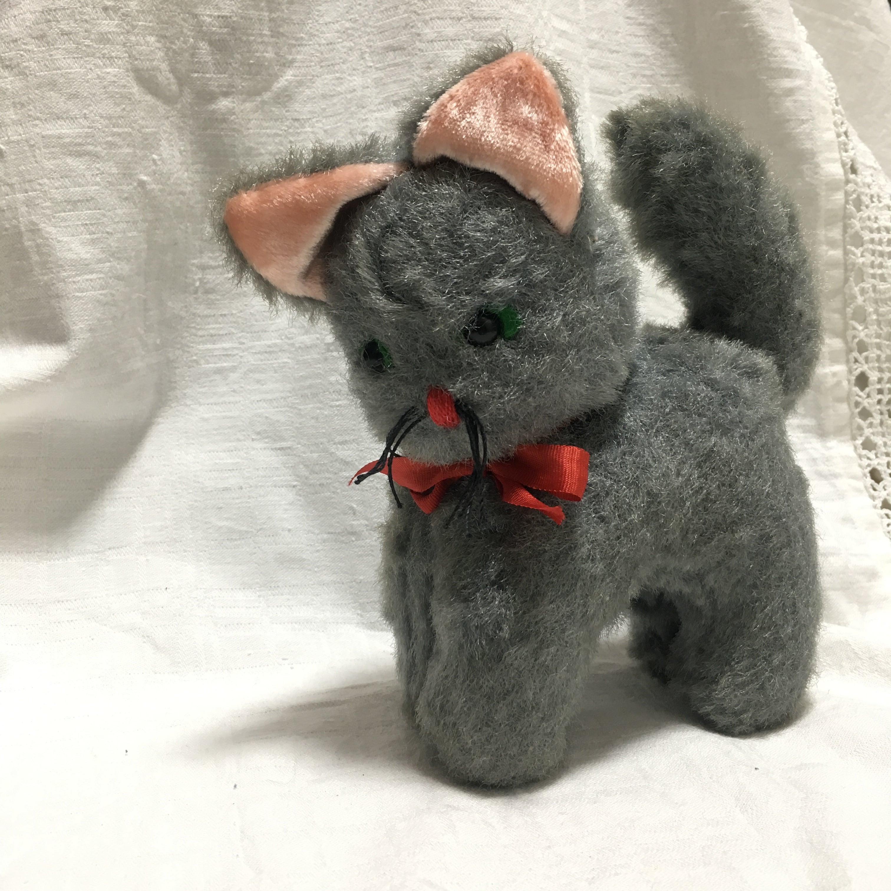 ちょっとヨレっとしたグレーの猫のぬいぐるみ。