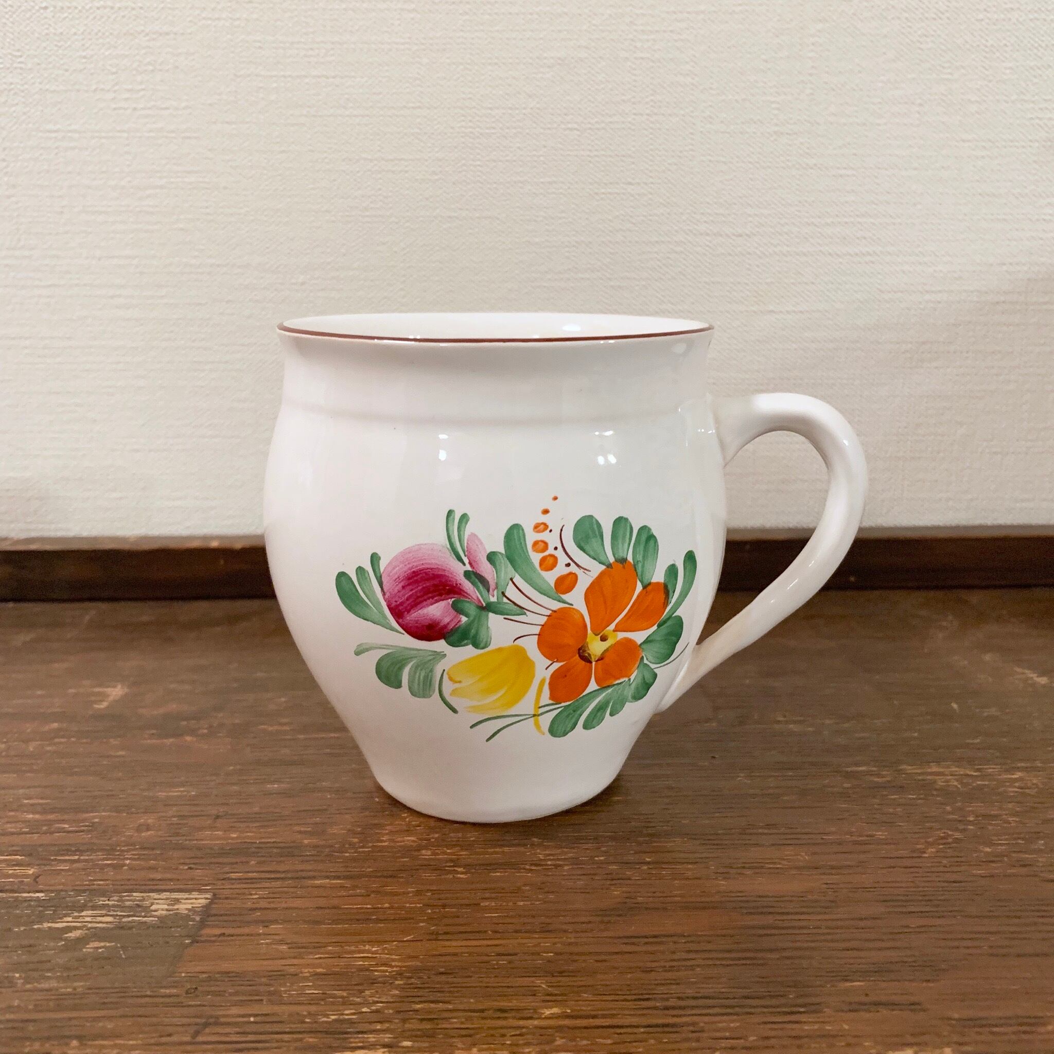 ハンガリー刺繍をモチーフにしたような手描き絵付けのマグカップ。