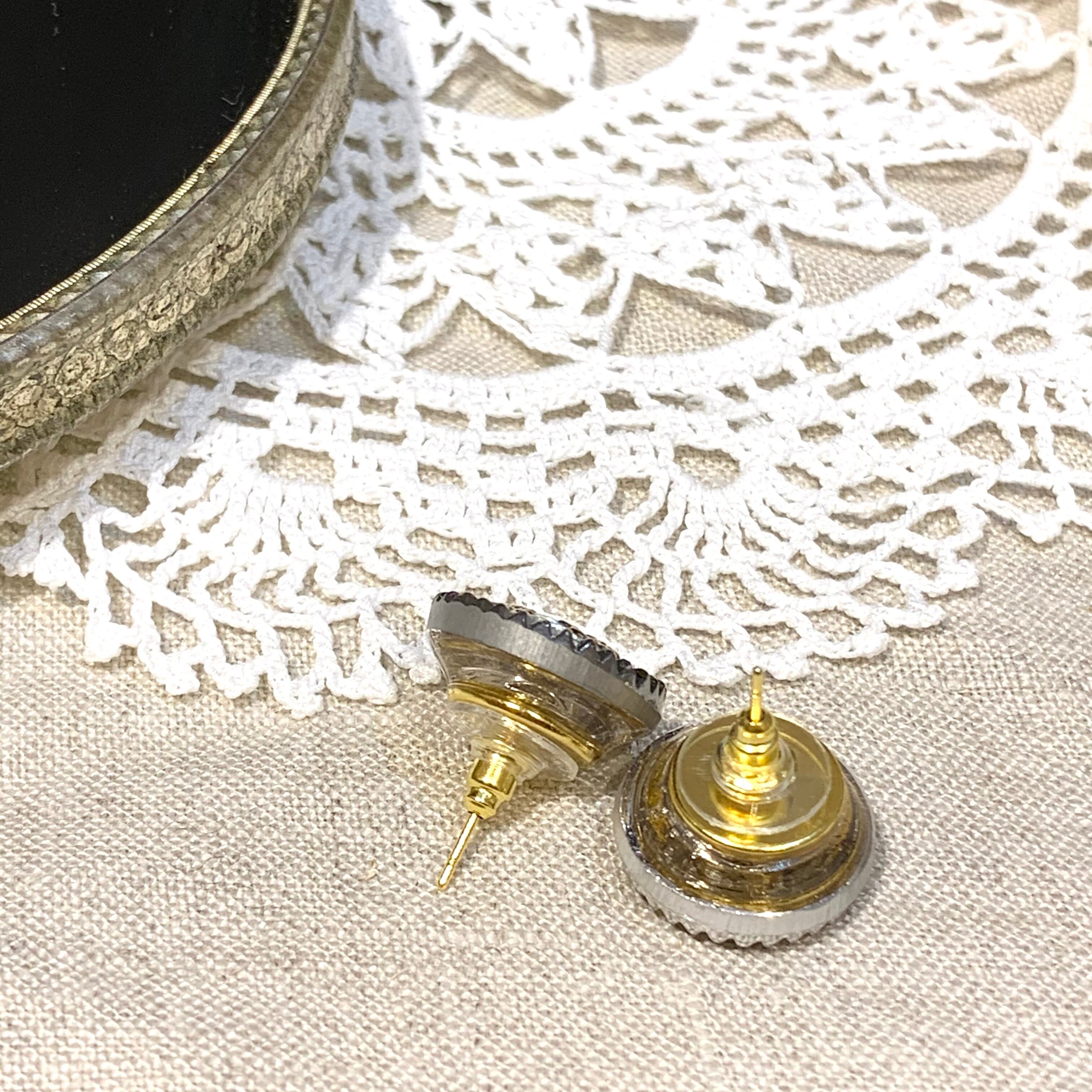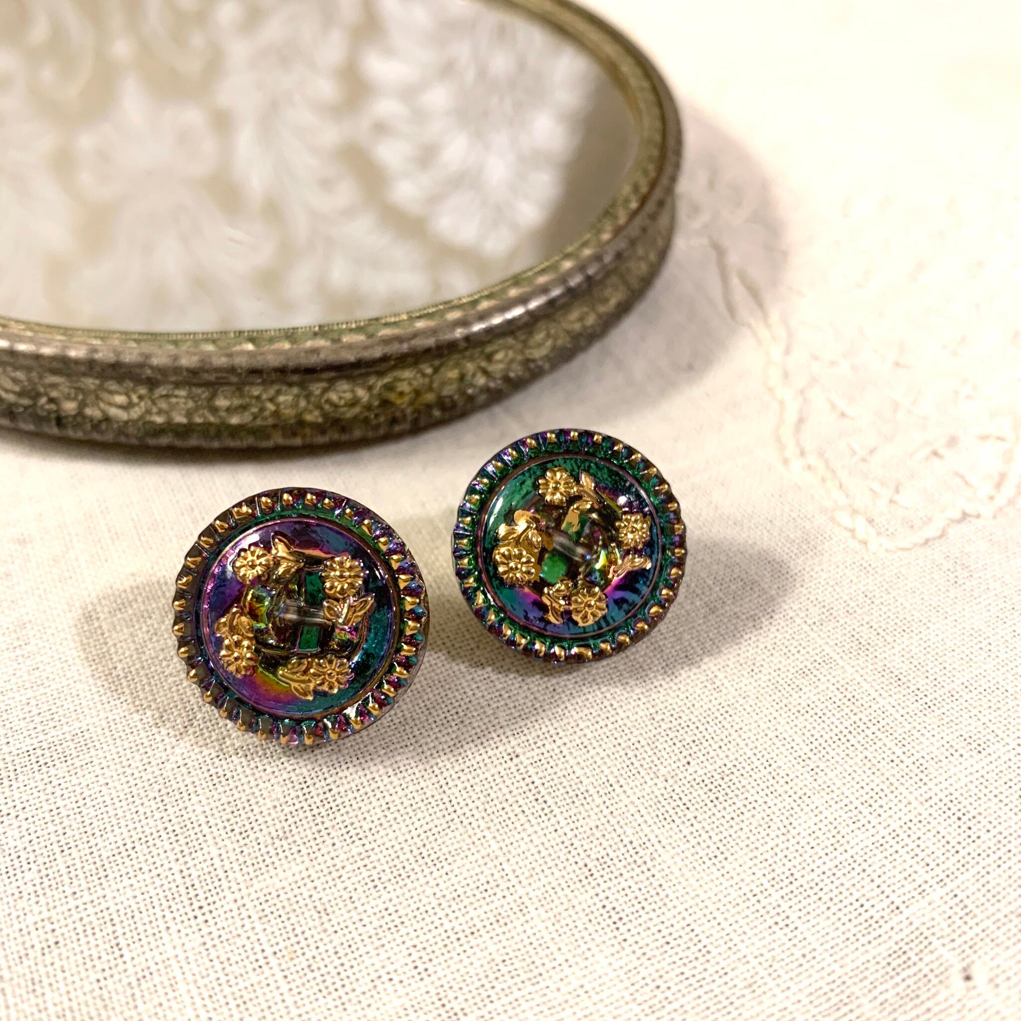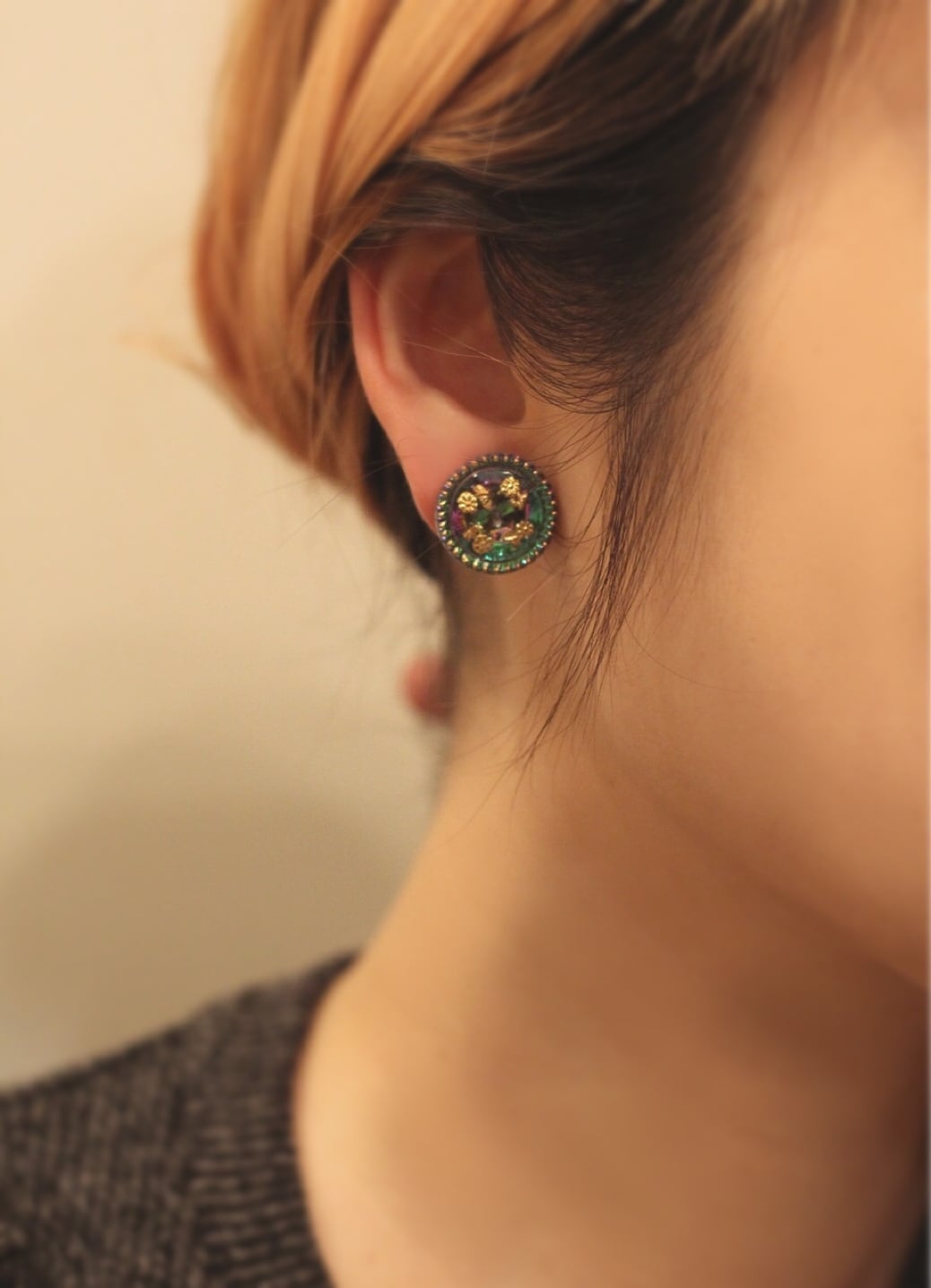 チェコで買い付けた手づくりのガラスボタンを使用したイヤリングとピアスです。