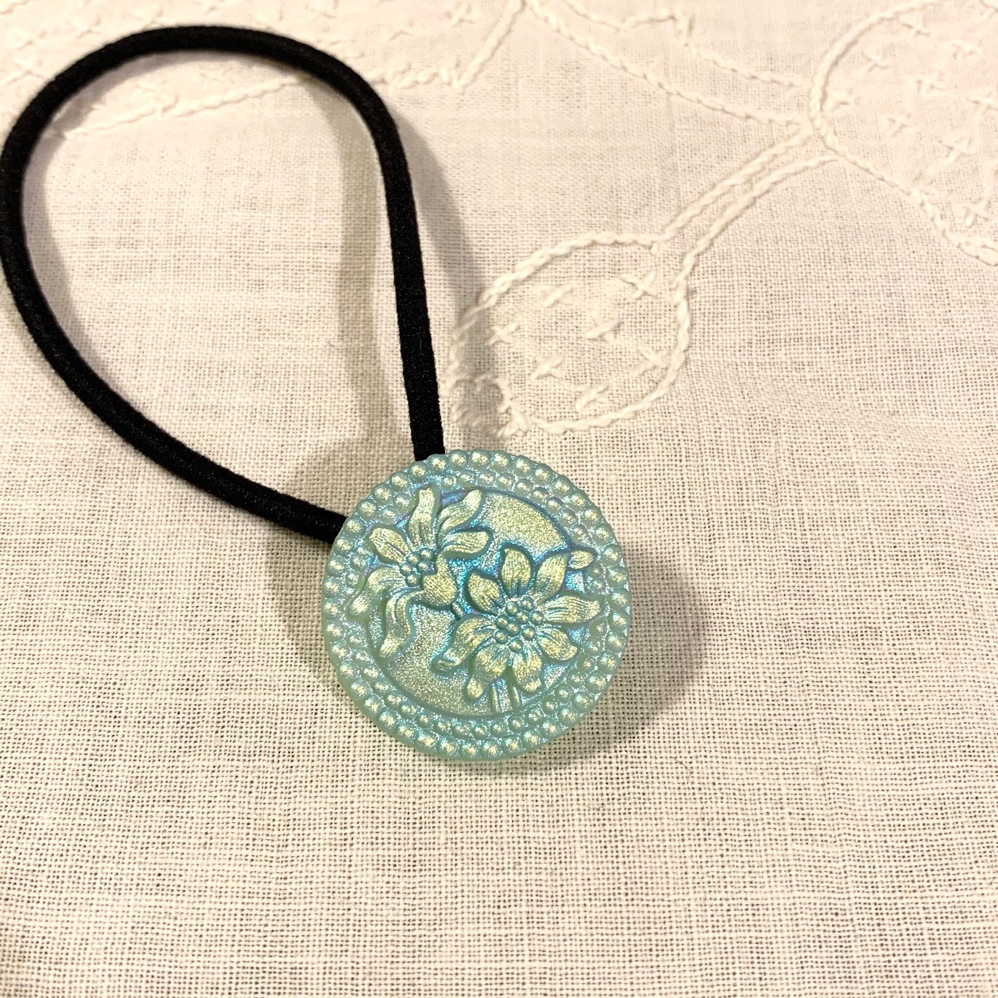 チェコで買い付けた手づくりのガラスボタンを使用したヘアゴムです。