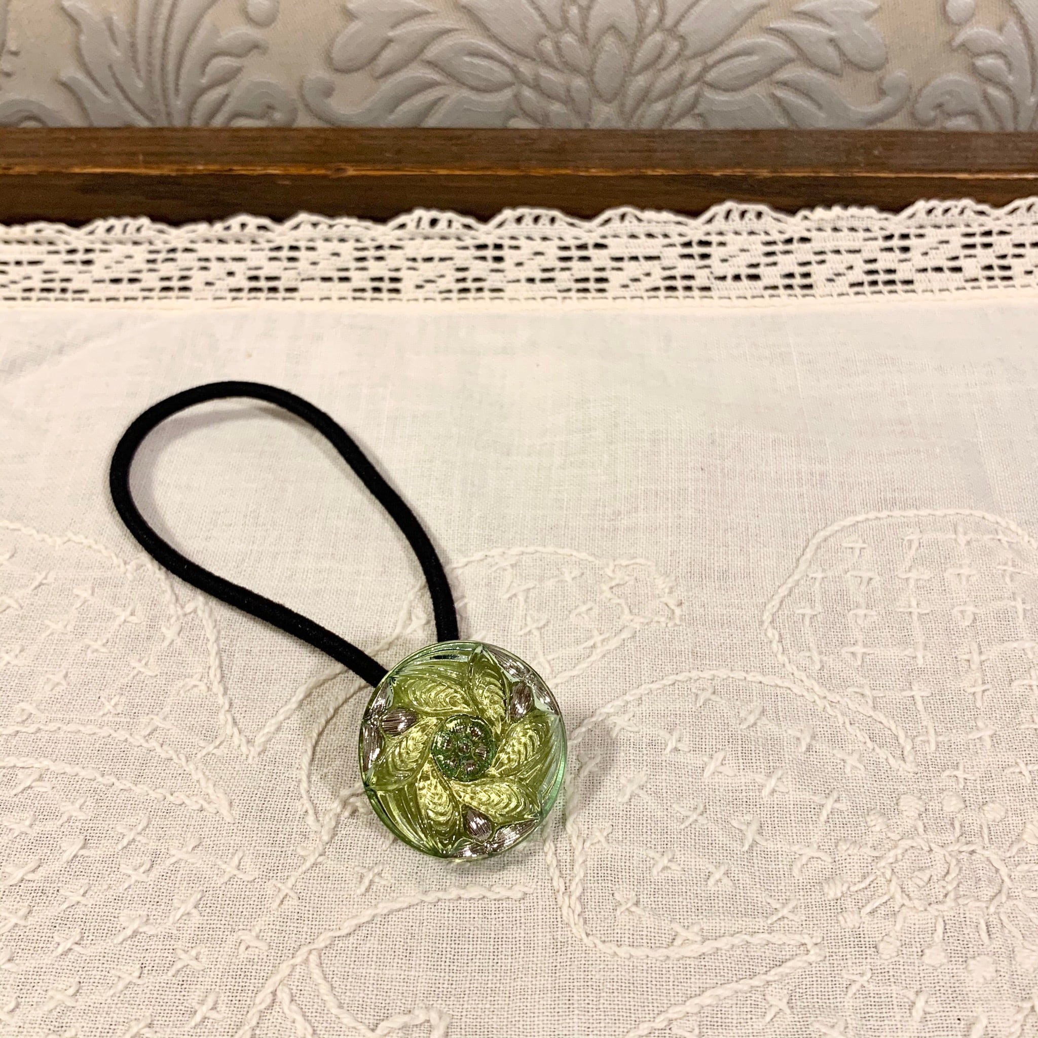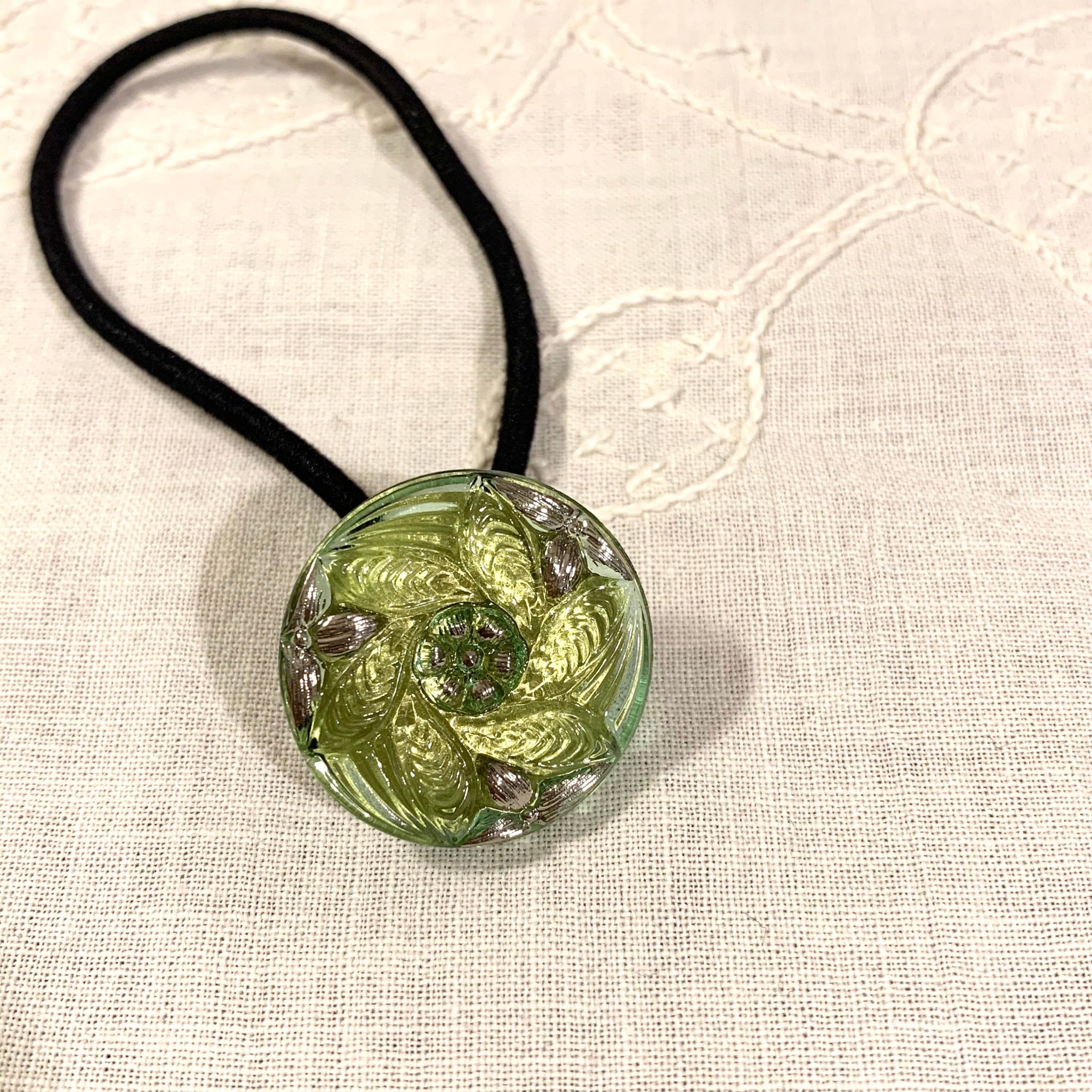 チェコで買い付けた手づくりのガラスボタンを使用したヘアゴムです。