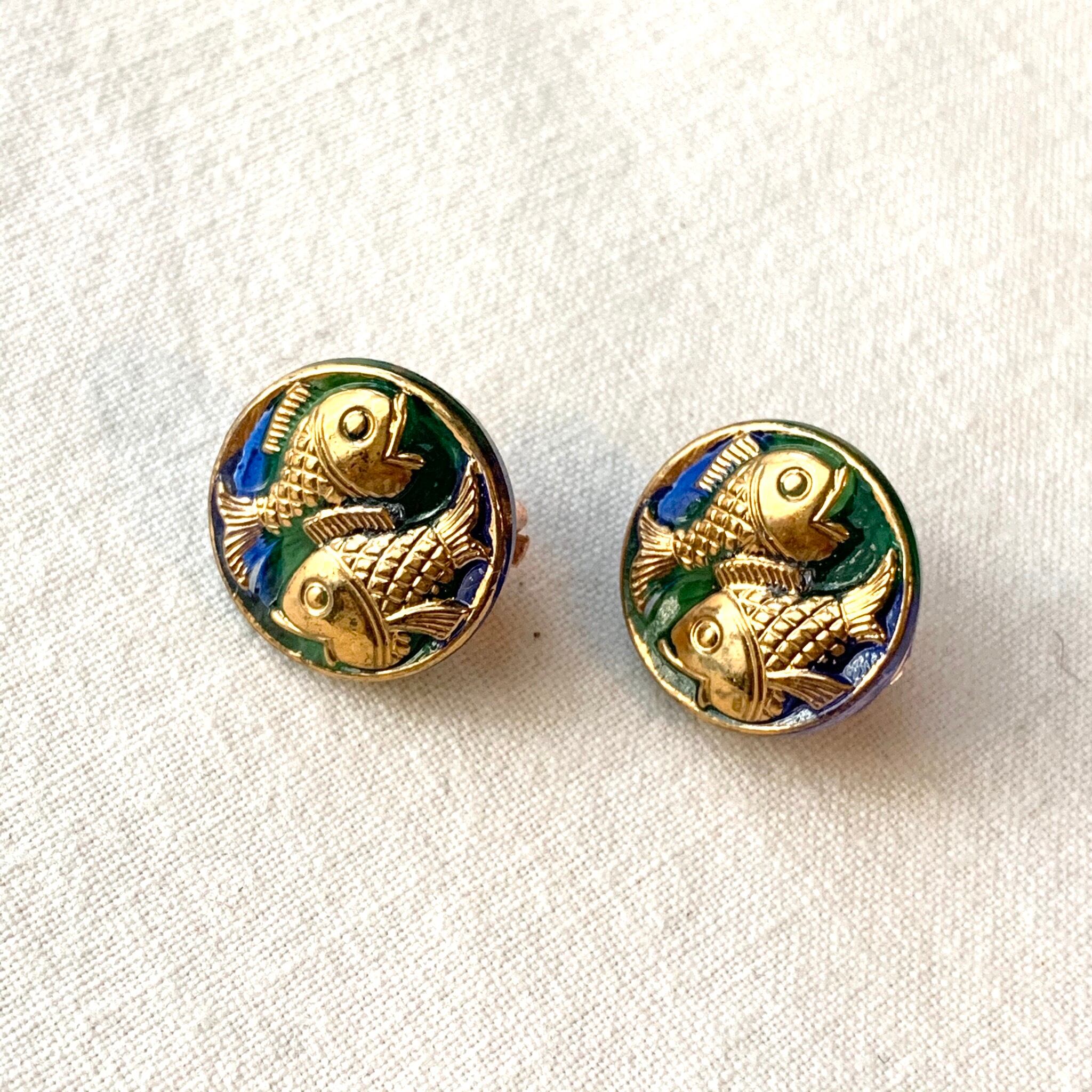 グリーンベースのガラスにゴールドで魚のモチーフが絵付けされたボタンを使用してイヤリングに加工しました。