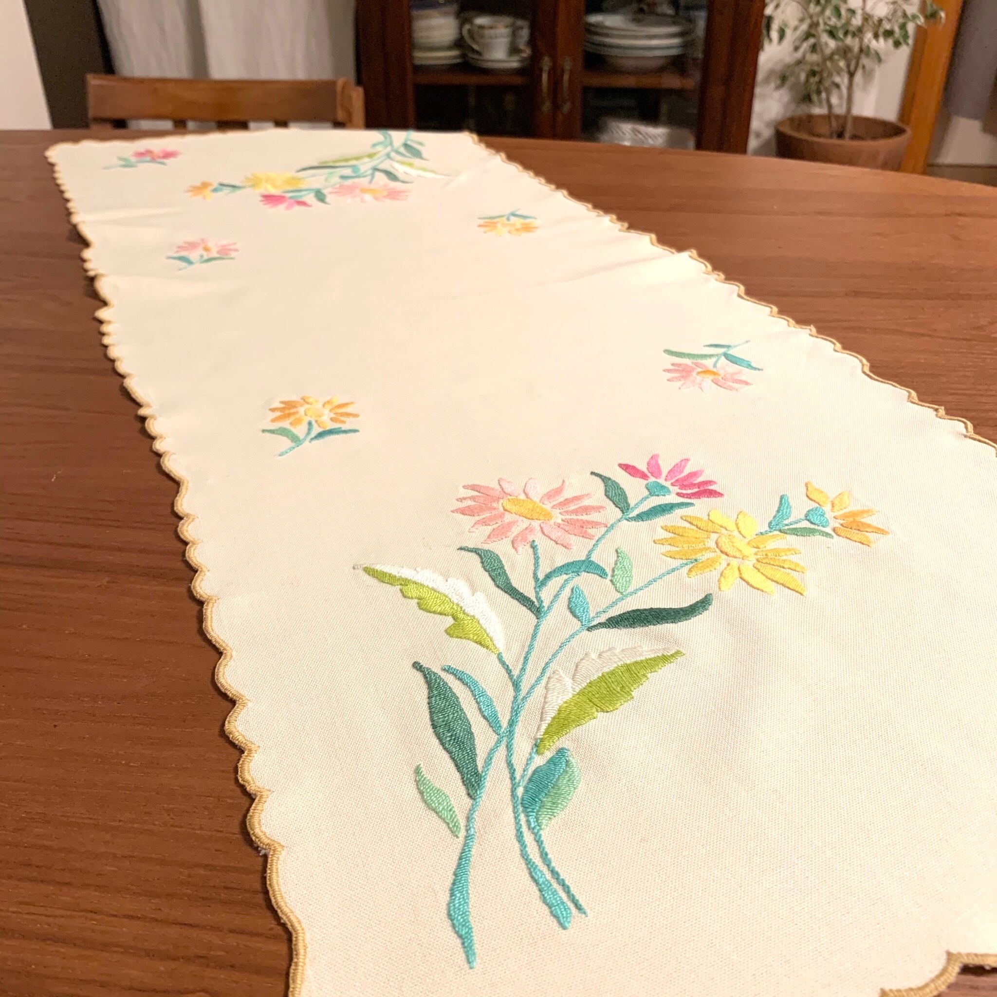 クリームカラーの基布にガーベラの花が刺繍されています。