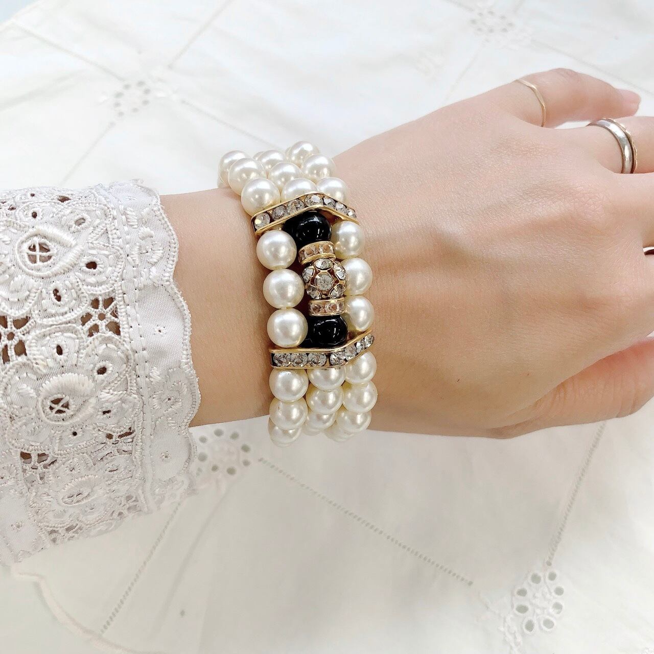 3連のパールの中央にはクリアのガラスパーツとブラックのビーズがデザインされています。