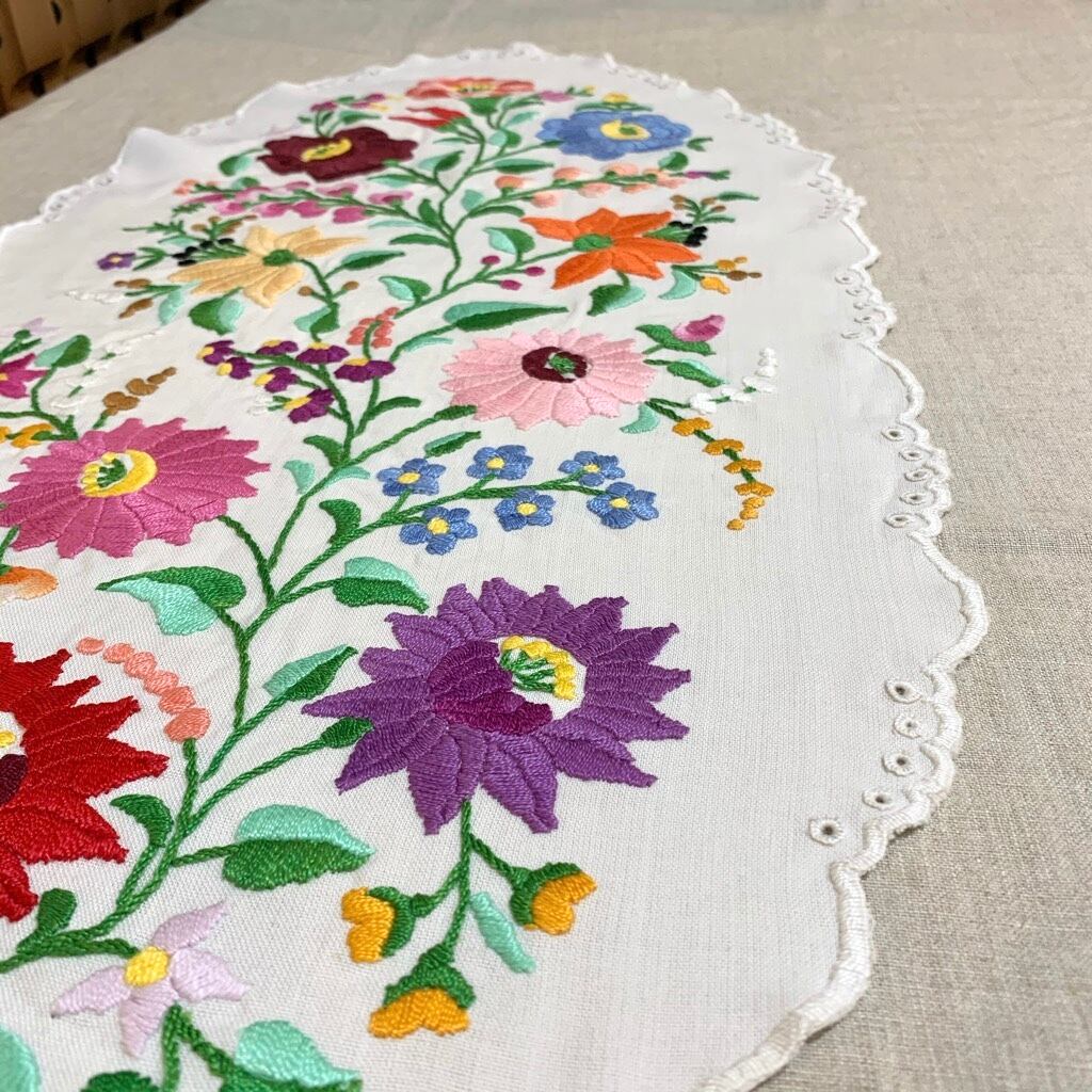 大胆な構図で様々な草花を入れたハンガリーのカロチャ刺繍。