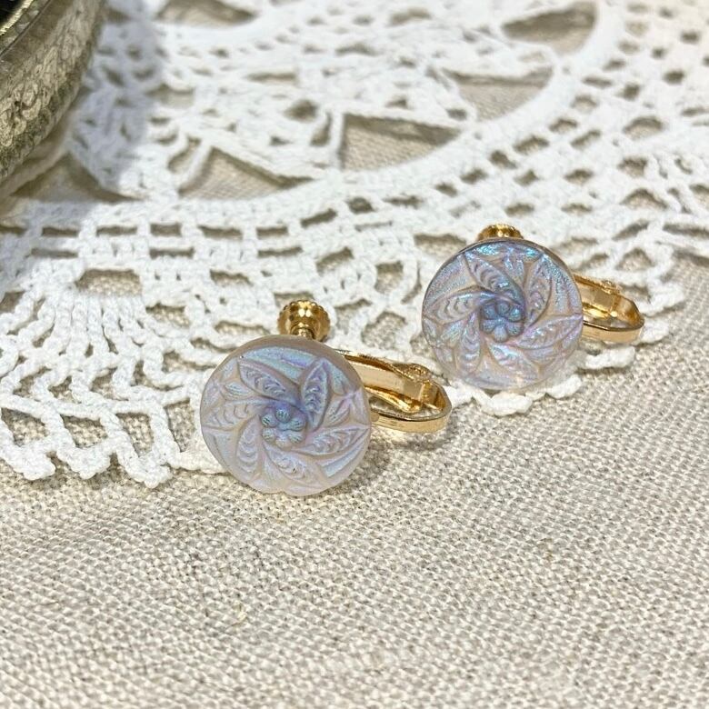 チェコで買い付けた手づくりのガラスボタンを使用したイヤリング&ピアスです。