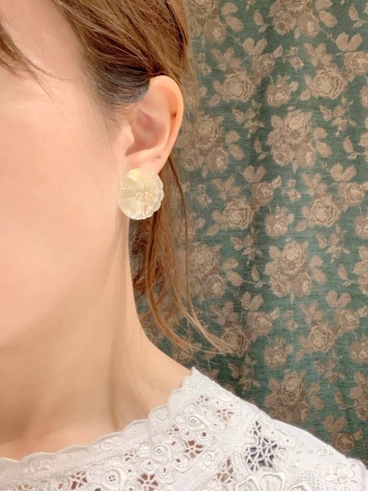 ガラスボタンらしいクリアカラーベースにゴールドの着彩でお花が描かれているデザインをアクセサリーにしたオリジナル商品です。