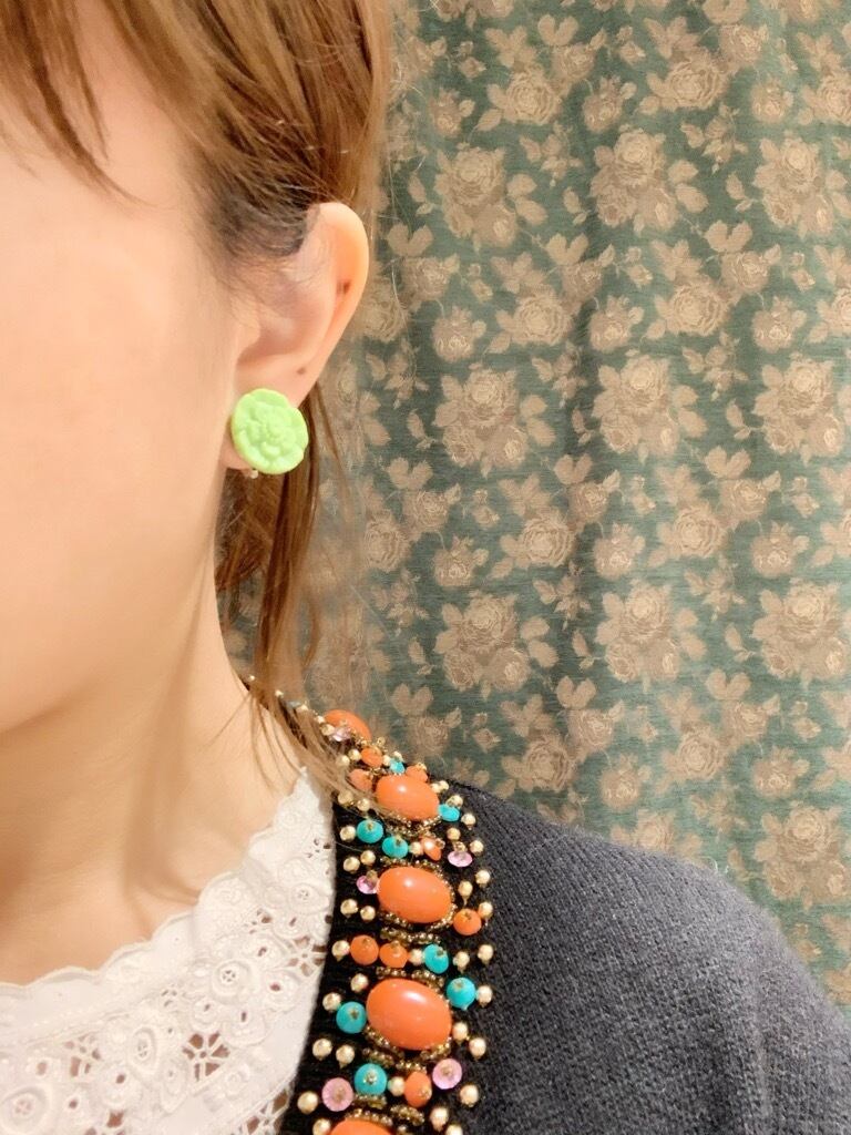 ビタミンカラーの立体的な花柄のボタンをアクセサリーに仕立てました。
