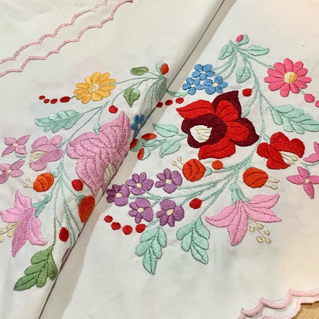 ハンガリー刺繍によく見られる薔薇を赤とピンクで対になるように配置したテーブルクロス。