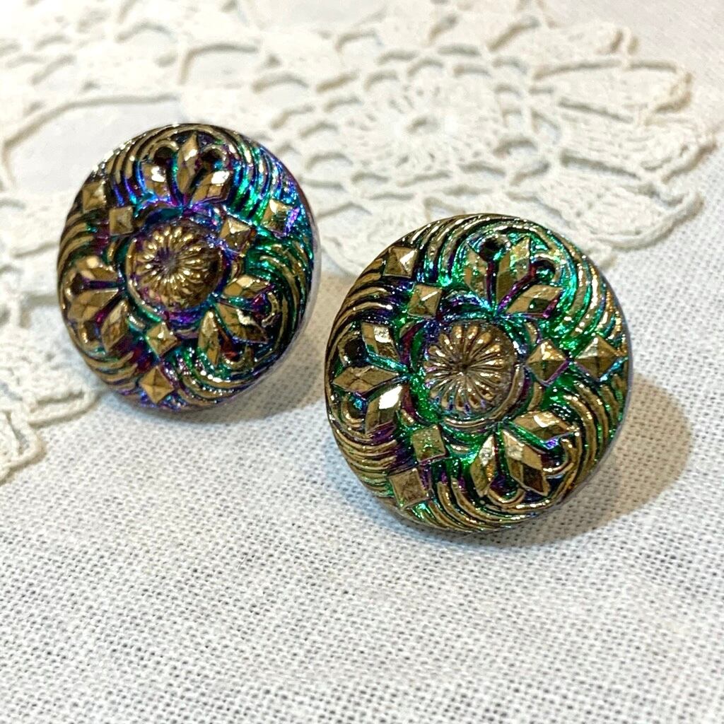 玉虫色に光る色付けとゴールドカラーの幾何学模様が特徴のボタンアクセサリーです。