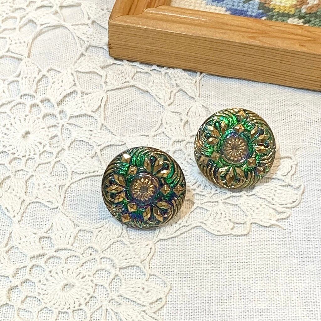 チェコで買い付けた手づくりのガラスボタンを使用したイヤリングとピアス。