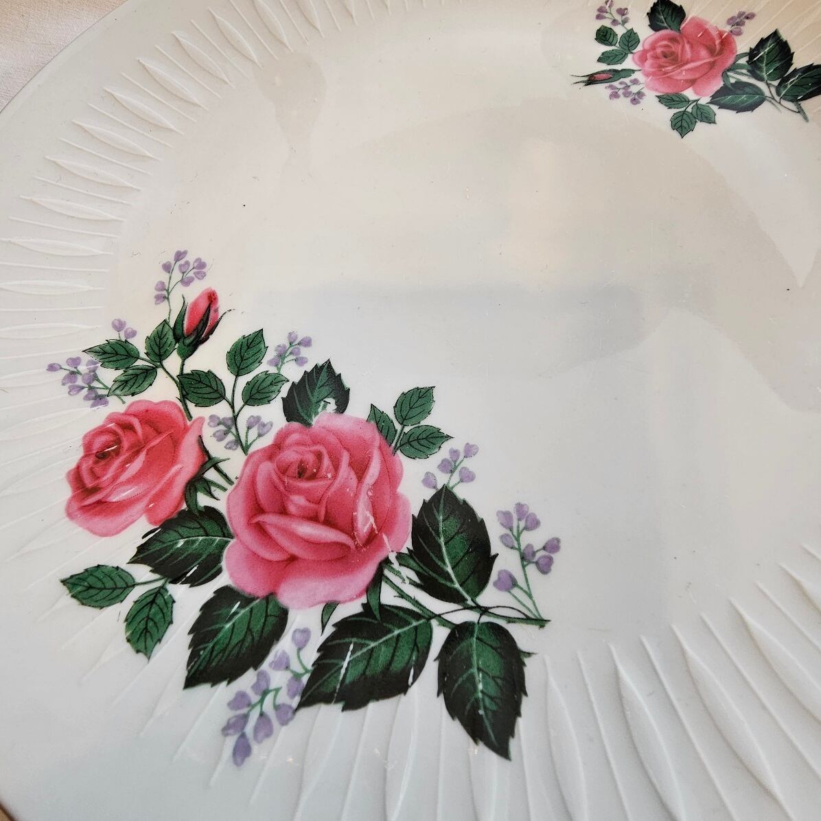 ピンクの薔薇のモチーフとリムに近い部分に葉のようなモチーフが刻印されているのがポイント。