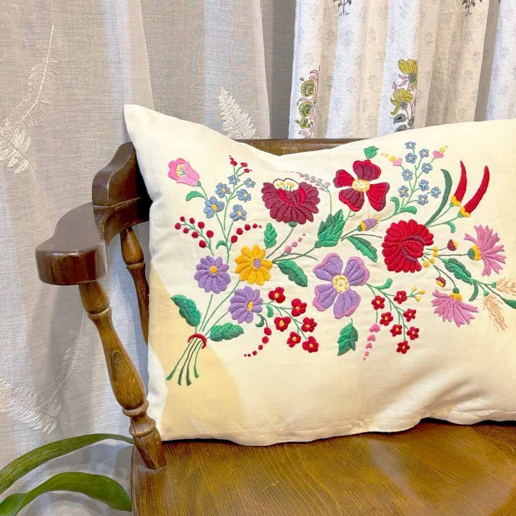 クリームイエローの基布にカロチャ刺繍らしいバラとパプリカのモチーフを大胆に配置したクッションカバー。メリハリのあるカラーがポイントのアイテムです。